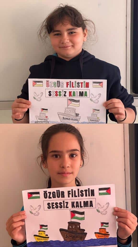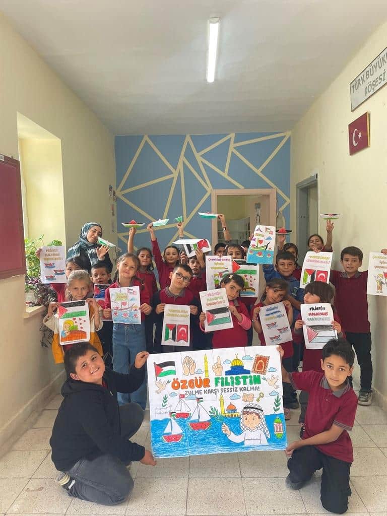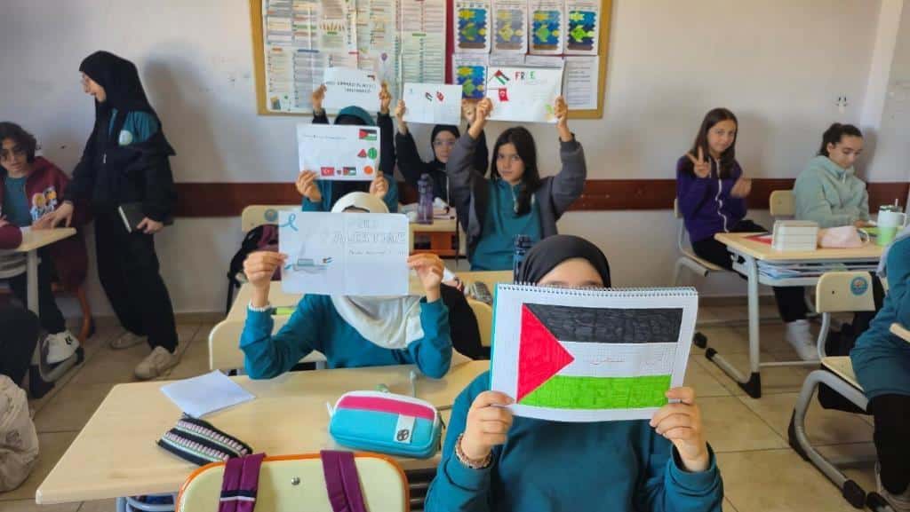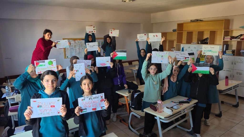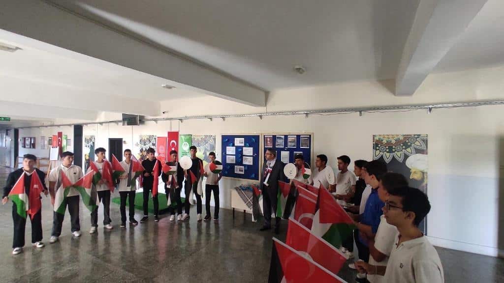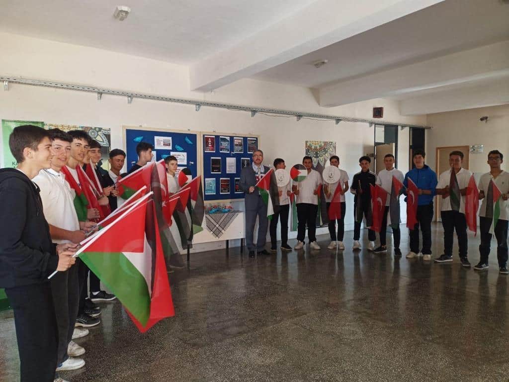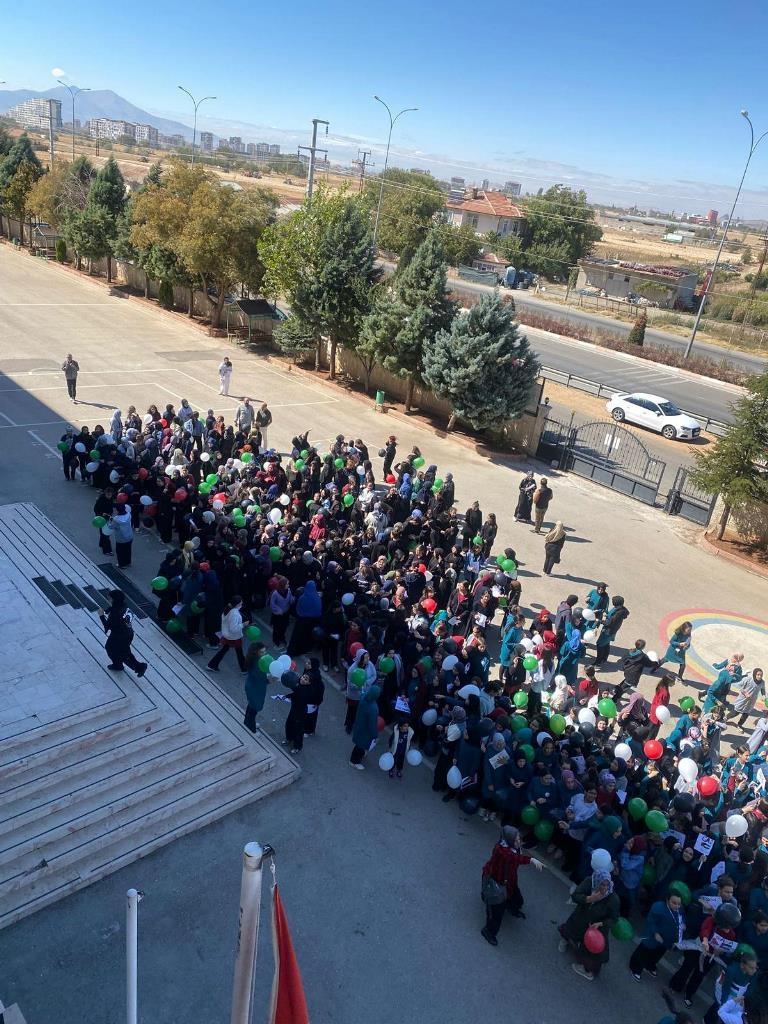 Filistin meselesi ve Küresel Sumud Filosu gündemi çerçevesinde düzenlenen etkinliklerde, eğitim camiası ortak bir vicdanı temsil etme sorumluluğuyla hareket etti. Öğrenciler, okul bahçelerinde ve salonlarda bir araya gelerek ellerinde Türk ve Filistin bayraklarıyla Gazze halkına destek mesajları verdi.