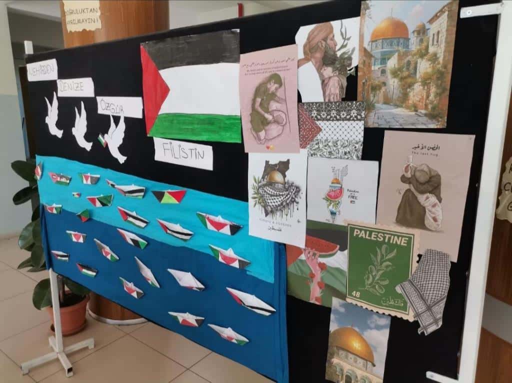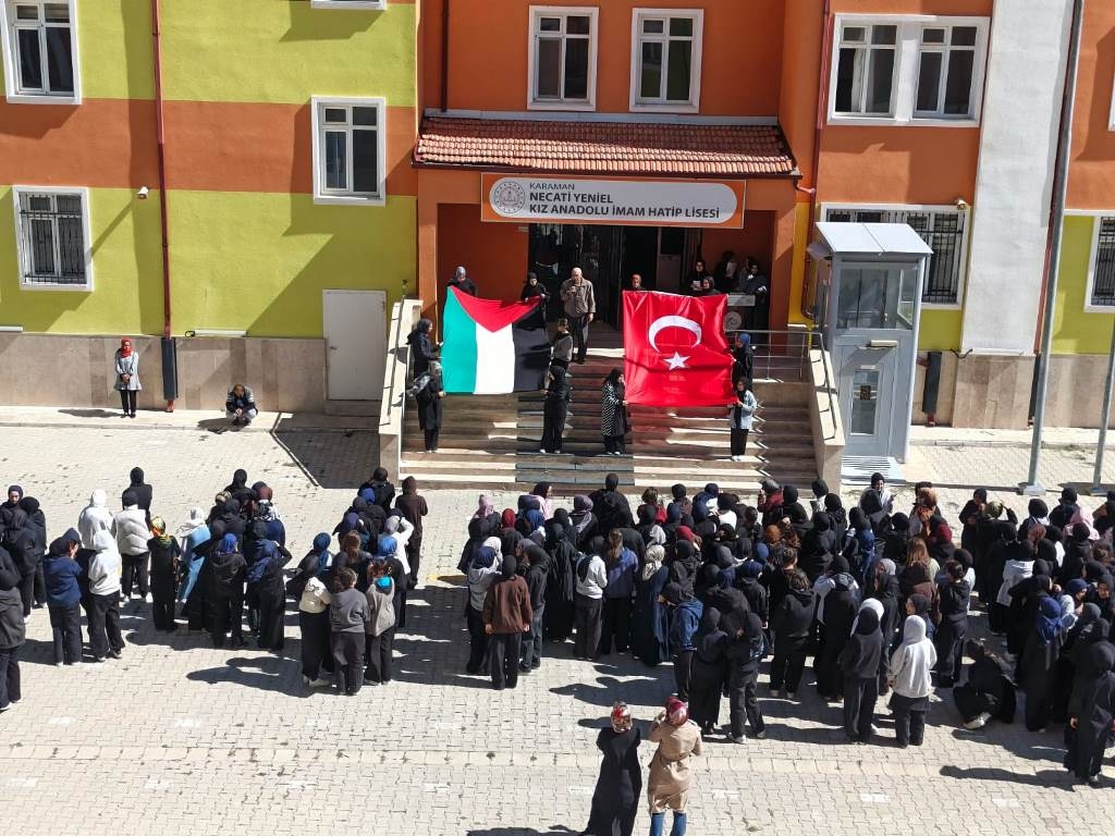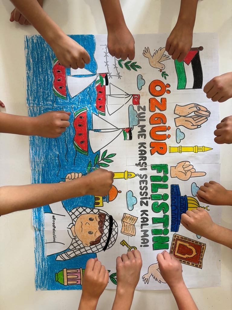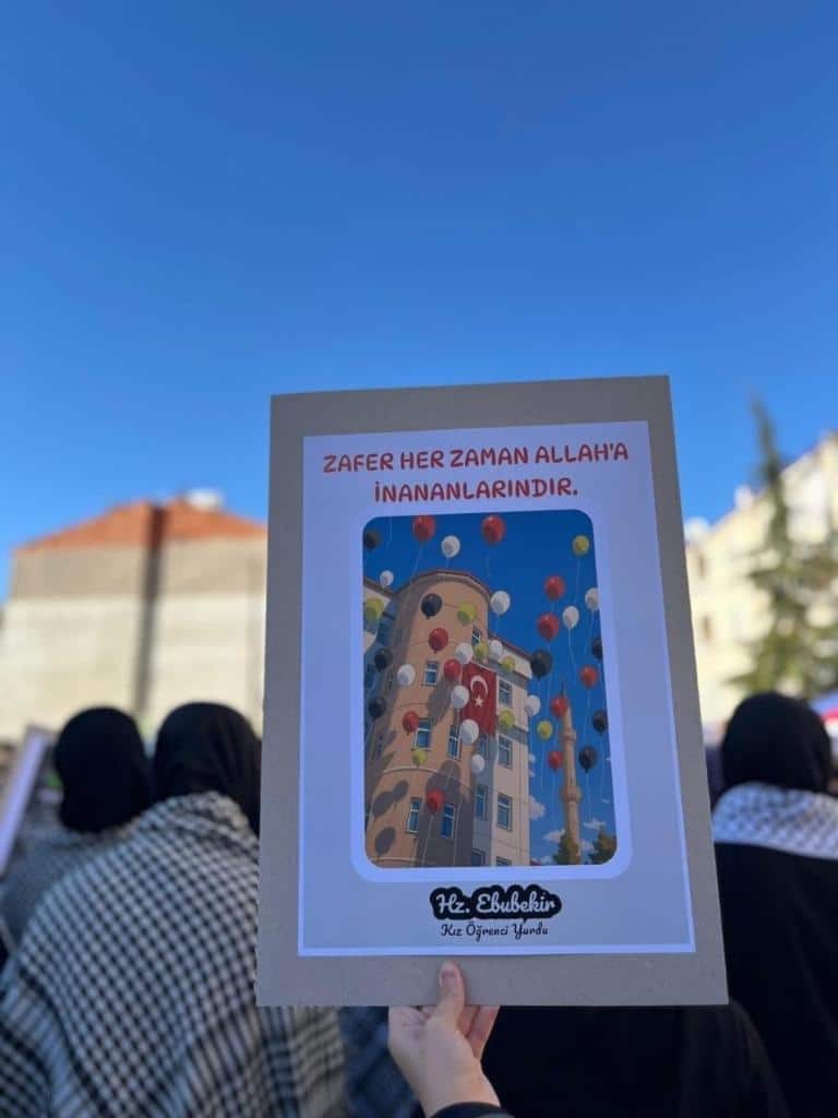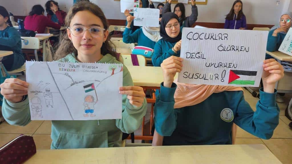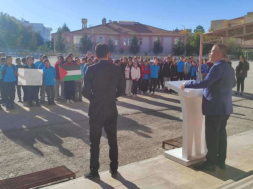 Filistin meselesi ve Küresel Sumud Filosu gündemi çerçevesinde düzenlenen etkinliklerde, eğitim camiası ortak bir vicdanı temsil etme sorumluluğuyla hareket etti. Öğrenciler, okul bahçelerinde ve salonlarda bir araya gelerek ellerinde Türk ve Filistin bayraklarıyla Gazze halkına destek mesajları verdi.